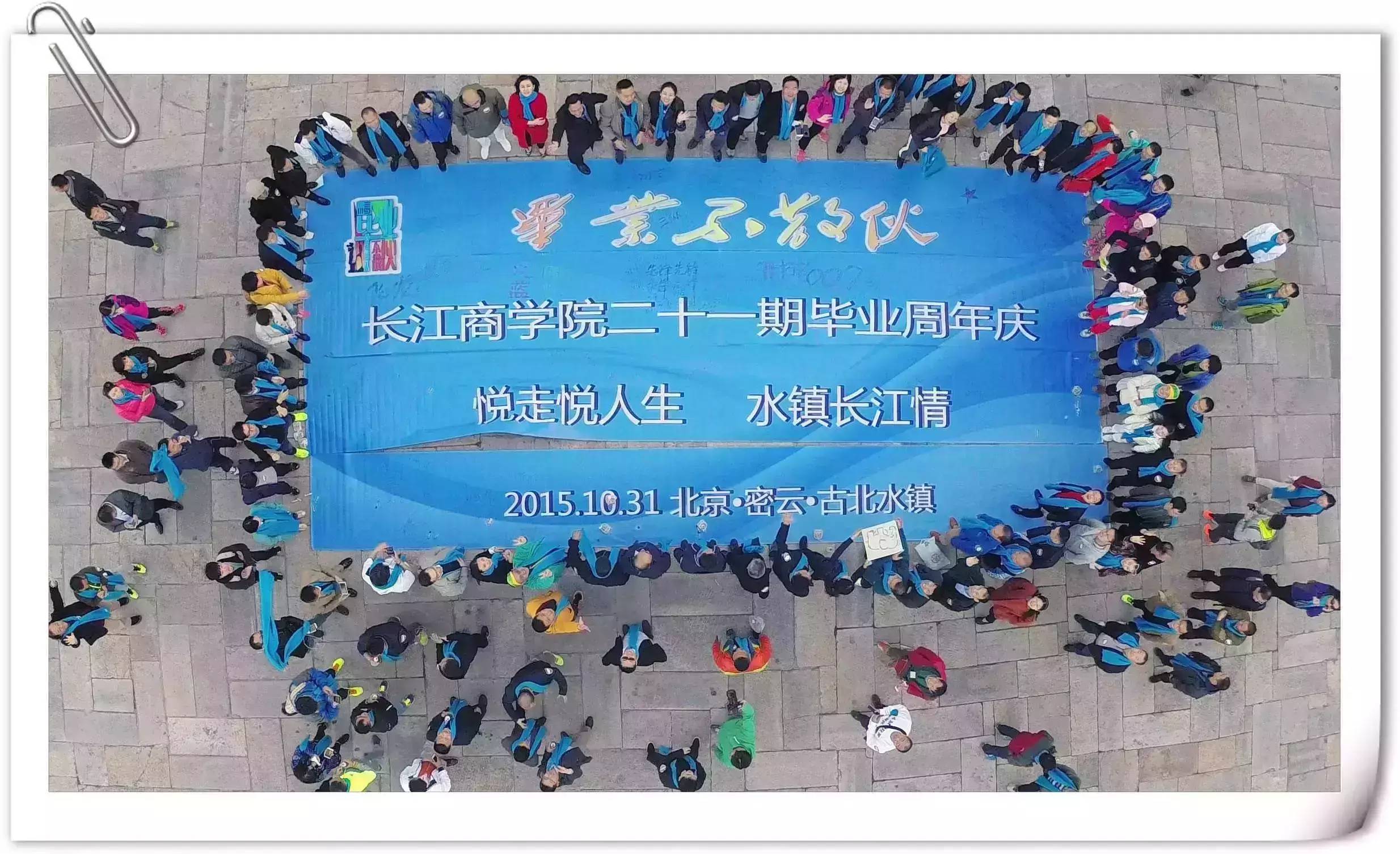 善跑团建中,长江校友以开学拓展队为单位,组成17个跑团,大家在水镇景区体验丰富多彩,富有水镇特点的项目,以团队为单位完成;同时,又在项目完成过程中,挥洒汗水,为公益而跑,未能来到现场的队友,也通过“善跑”为团队助力,此刻,所有21期校友的心紧紧连在一起!最后时刻,四个方阵的校友从四面八方汇聚广场,共同完成团队巨作,在航拍升空的那一刻,活动达到了高潮, “毕业不散伙”响彻水镇!